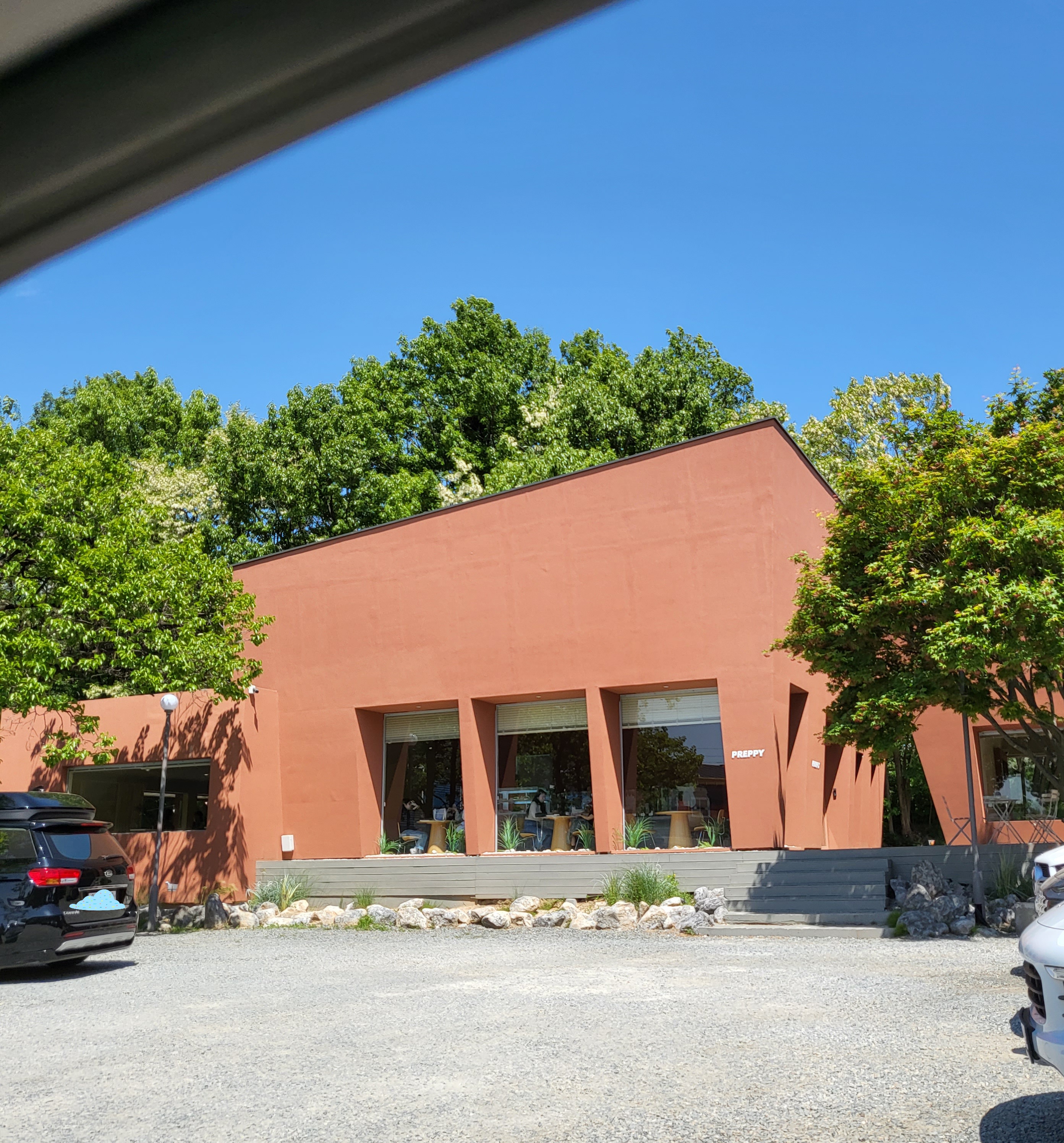 화사한 프레피 로고 앞에서 사진 찍는 분들이 많다 프레피는 왼쪽, 오른쪽 두동의 건물과 앞, 뒤 테라스로 이루어져있다 카페 주변에 나무가 많아서 자연 친화적이다 왼쪽 메인동에서 주문도 하고 차를 마실수 있고 오른쪽 동에서도 차를 마실수 있다 수름재에 위치하고 있어 율량동에서도 가깝다