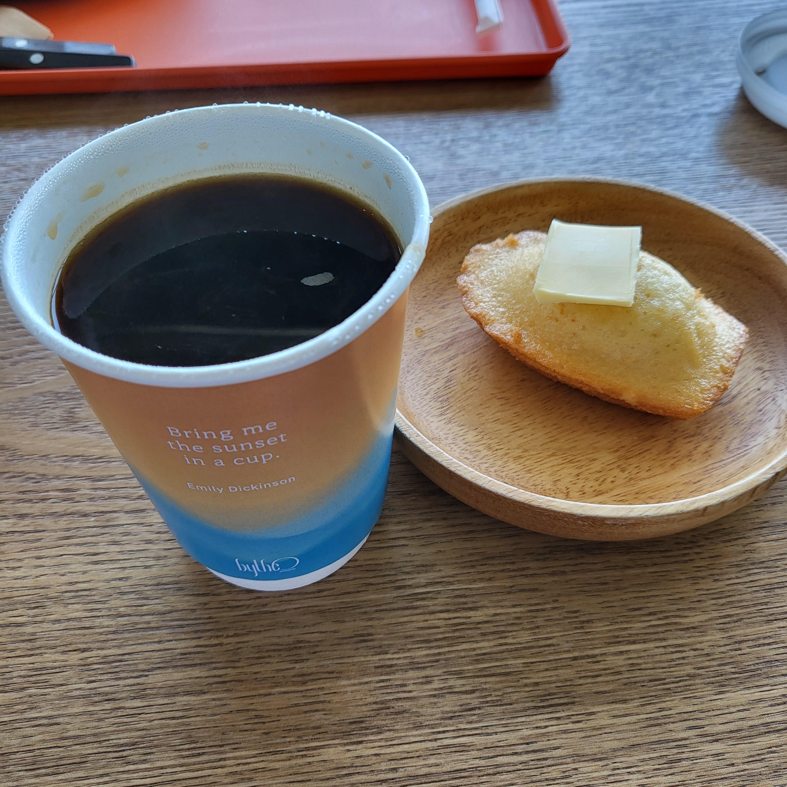 카페 규모에 비해 베이커리 종류가 많지 않다 아메리카노 5,500원 플레인마들렌 4천원