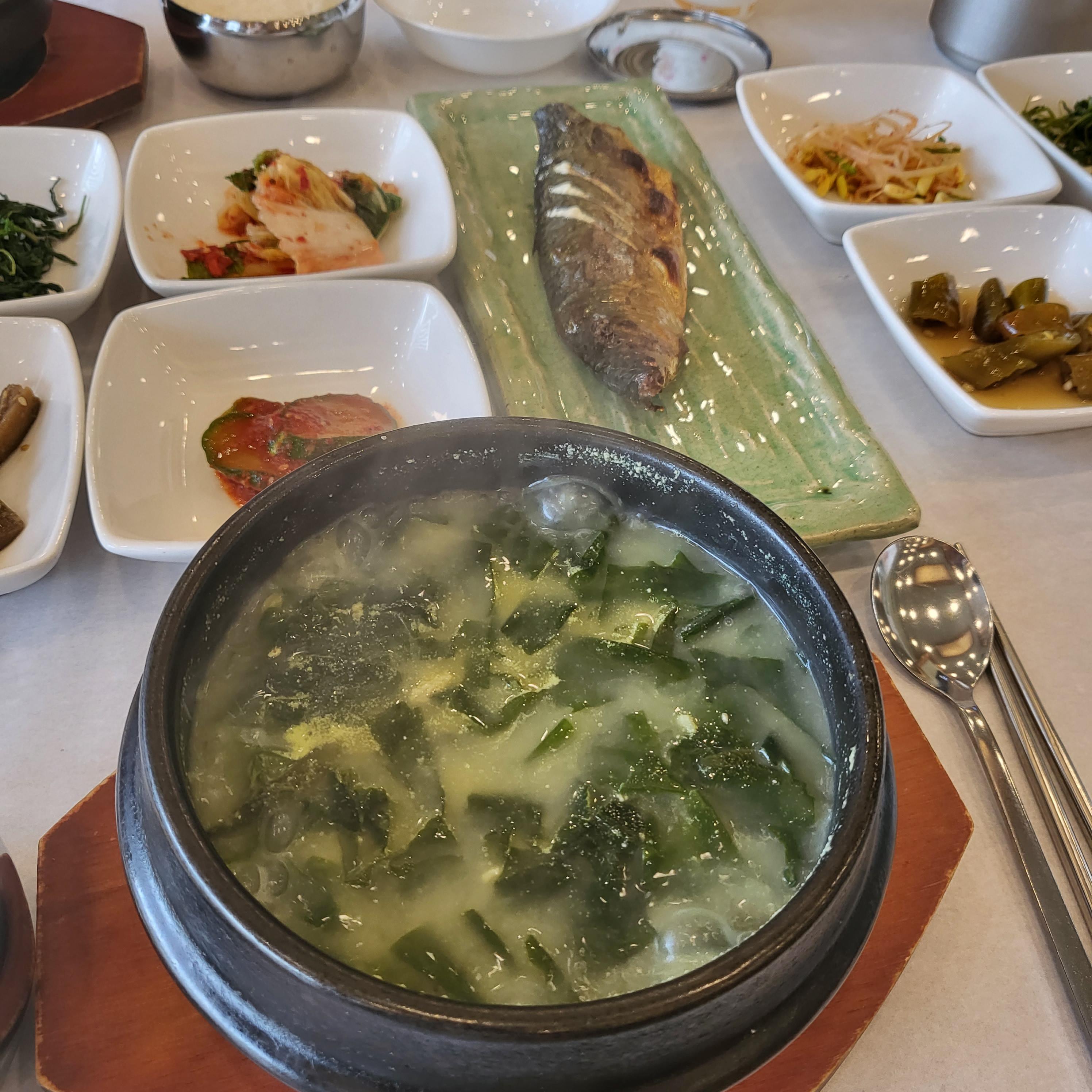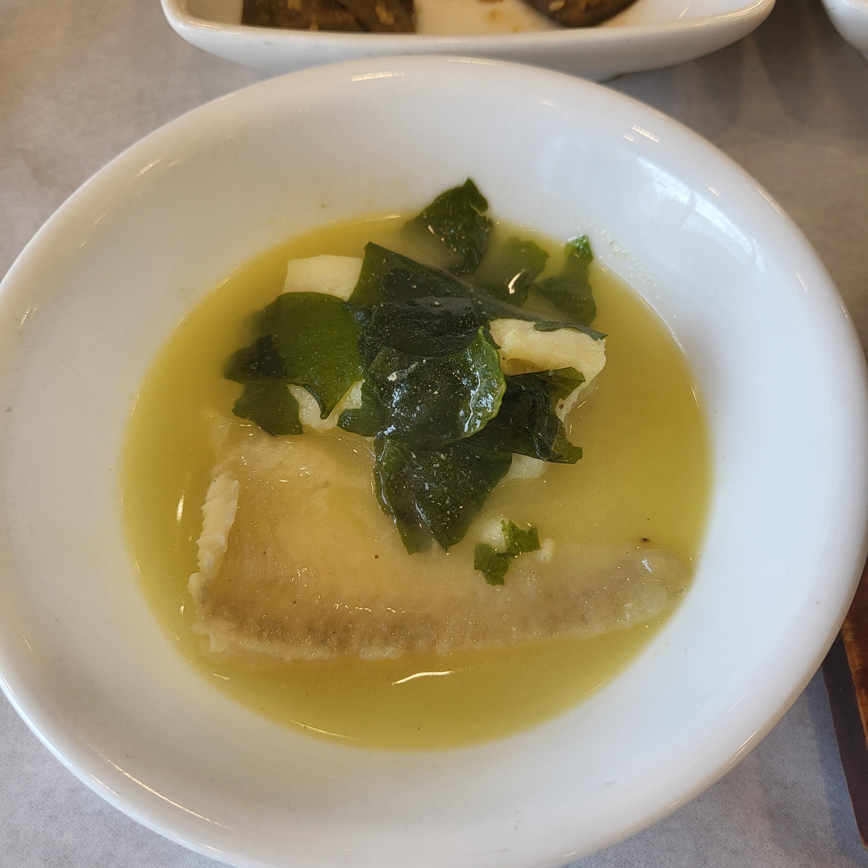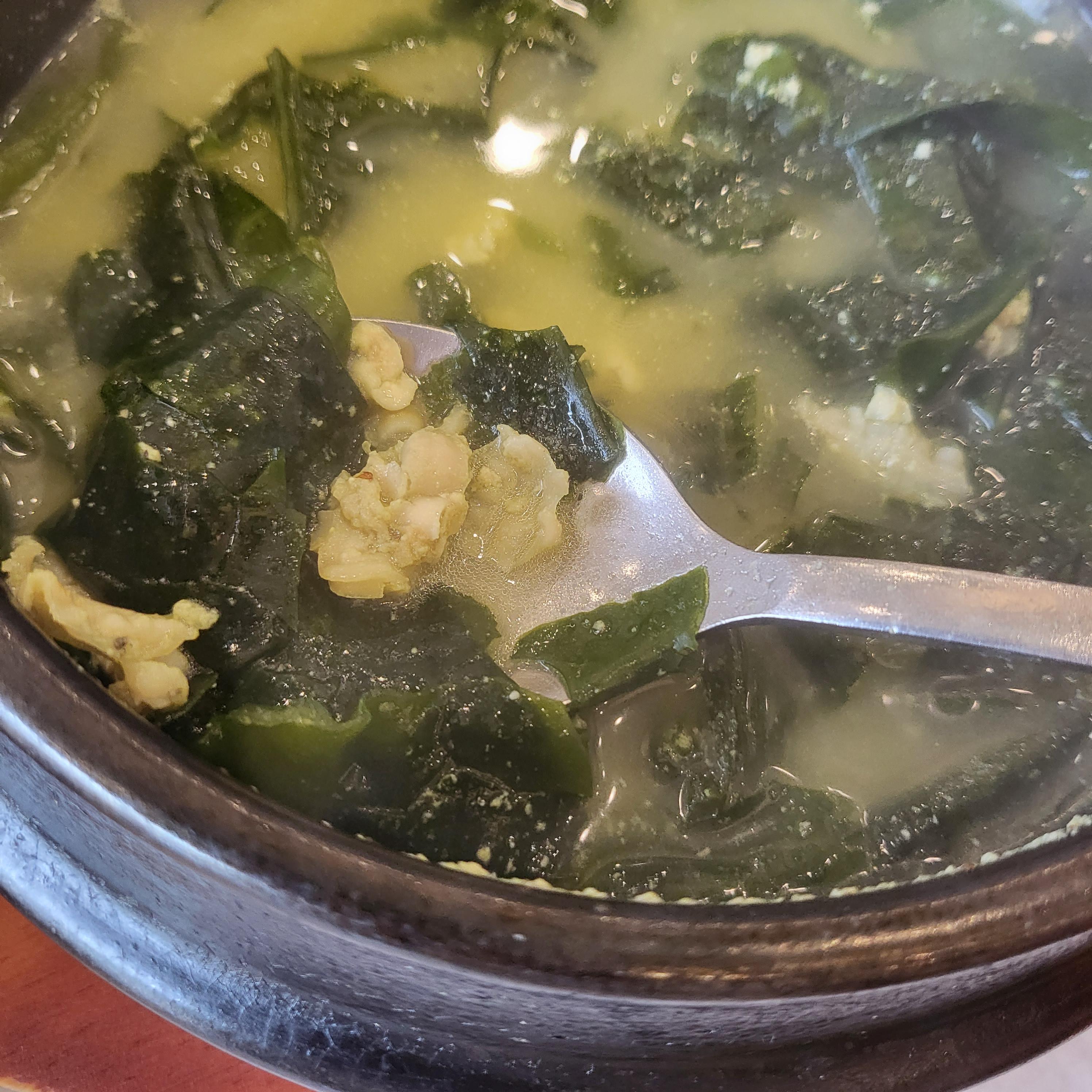 조개 미역국도 뽀얀 국물에 미역, 조개살이 듬뿍 들어있다 조개살이 부드러우면서 쫀득하고 비린내는 전혀 없다 많이 먹어도 속이 편안하고 든든하다