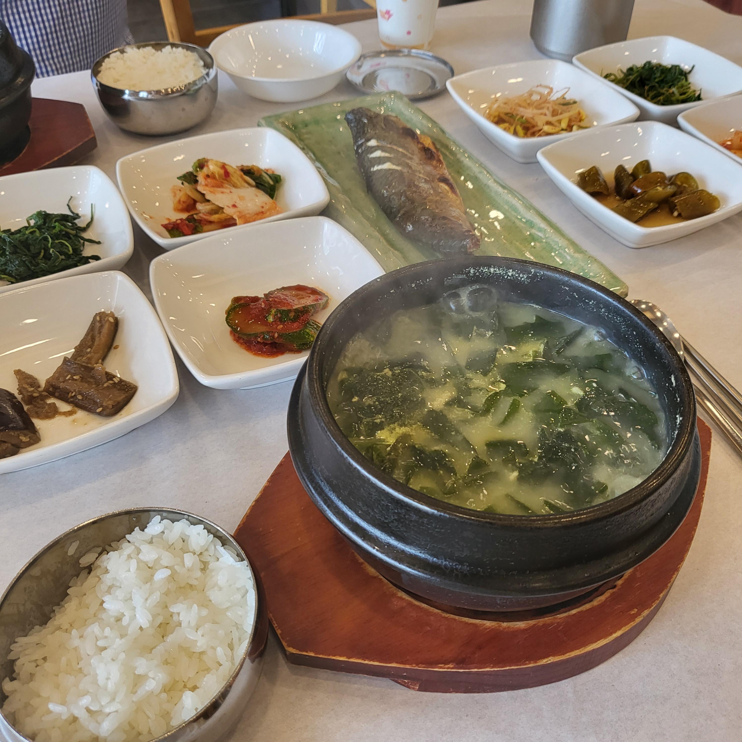 주문후 기본반찬이 나오는데 딱 깔끔하고 정갈한 한식 상차림이다 참, 미역국 2인 이상 주문시 생선구이 서비스가 나온다