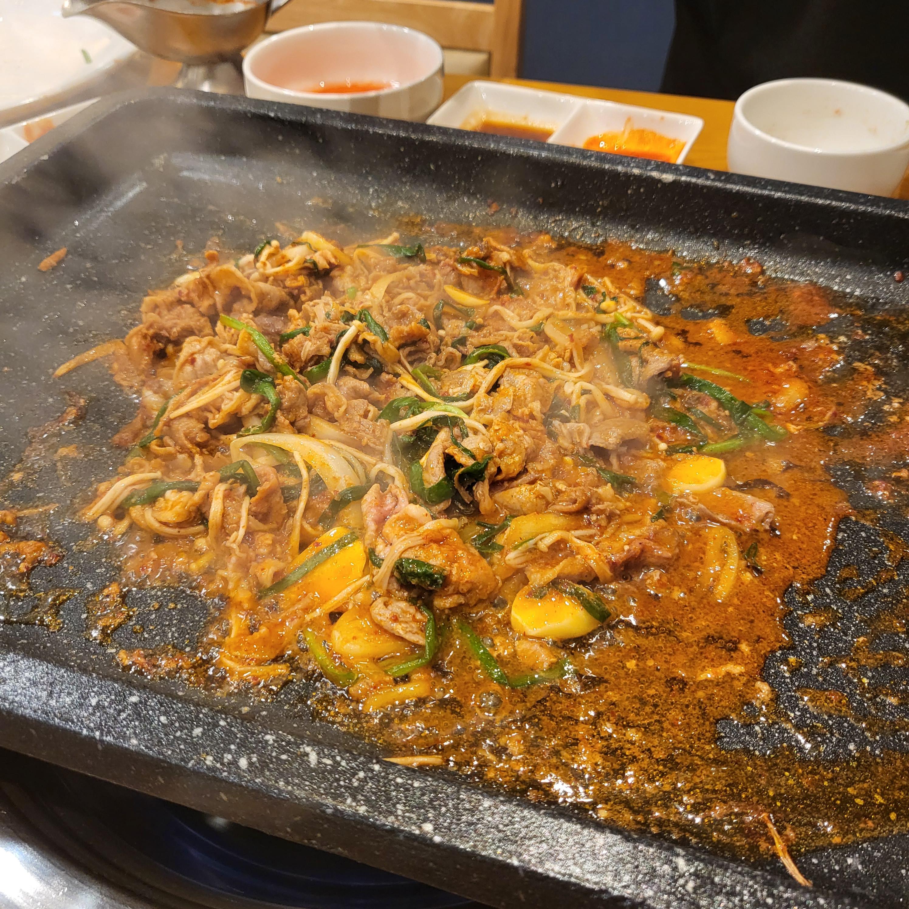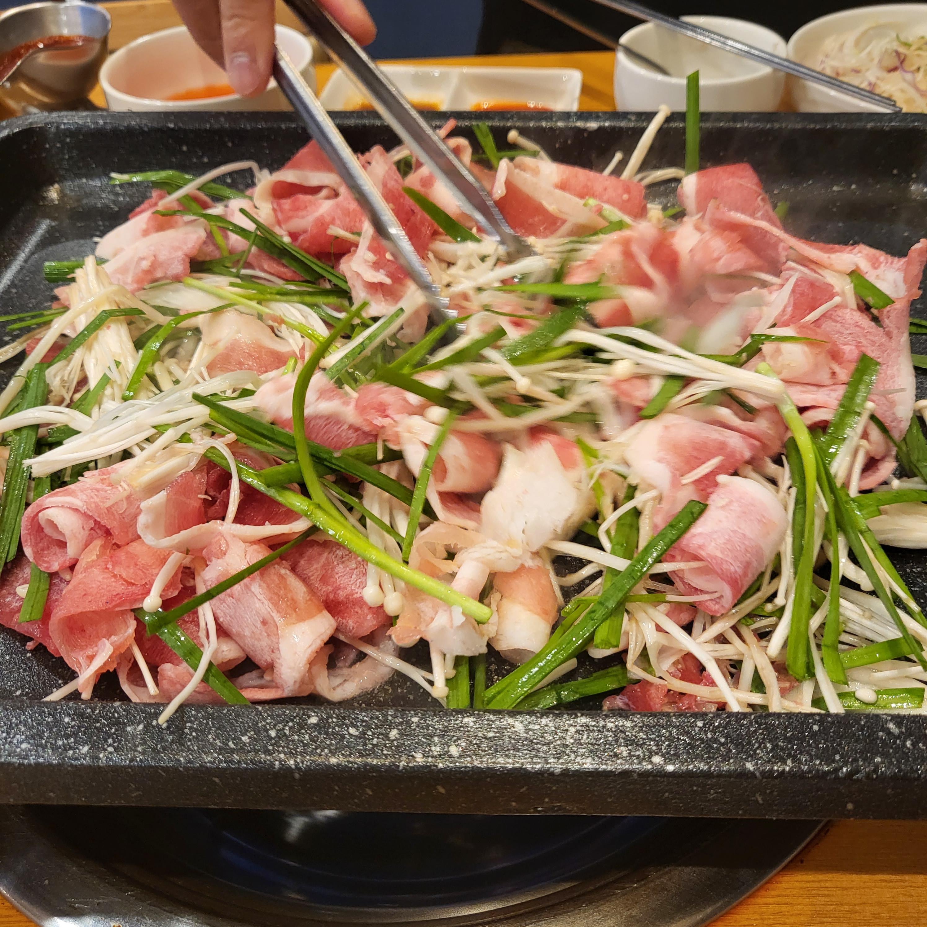 불판에 올려 맛있게 볶아요 고사리 나물도 올려서 함께 구워 먹으면 별미에요
