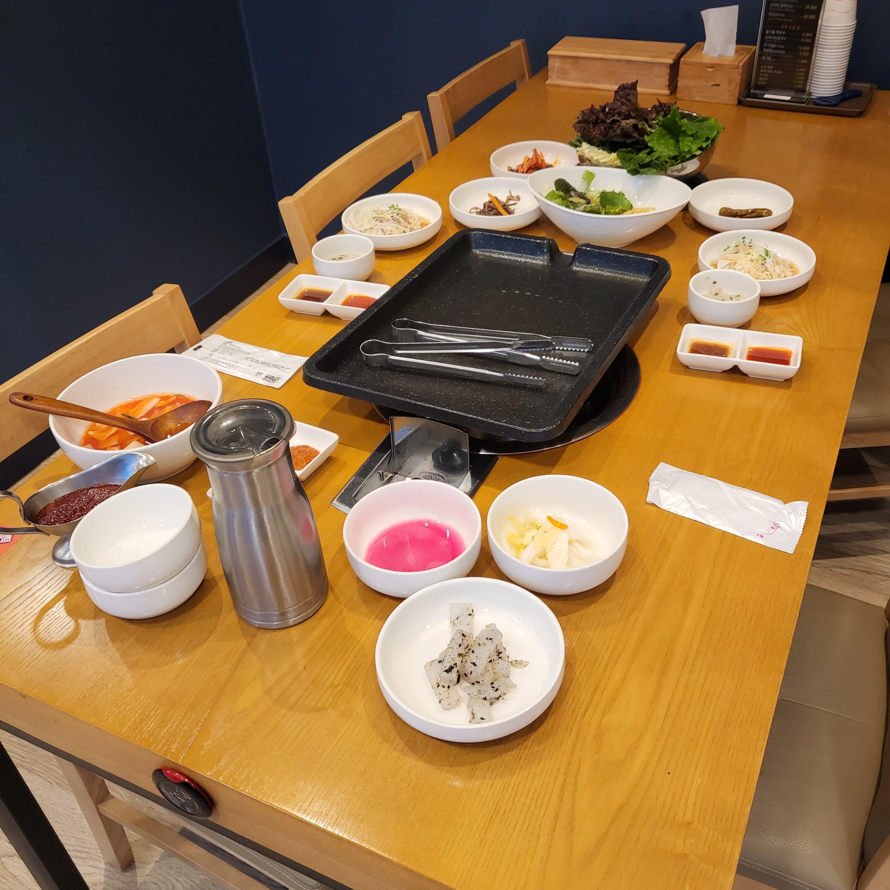 산더미오리에는 셀프바에 밑반찬과 쌈야채, 소스까지 잘 준비 되어 있어서 편리해요 오리불고기는 쌈야채와 함께 먹으면 더 맛있어요