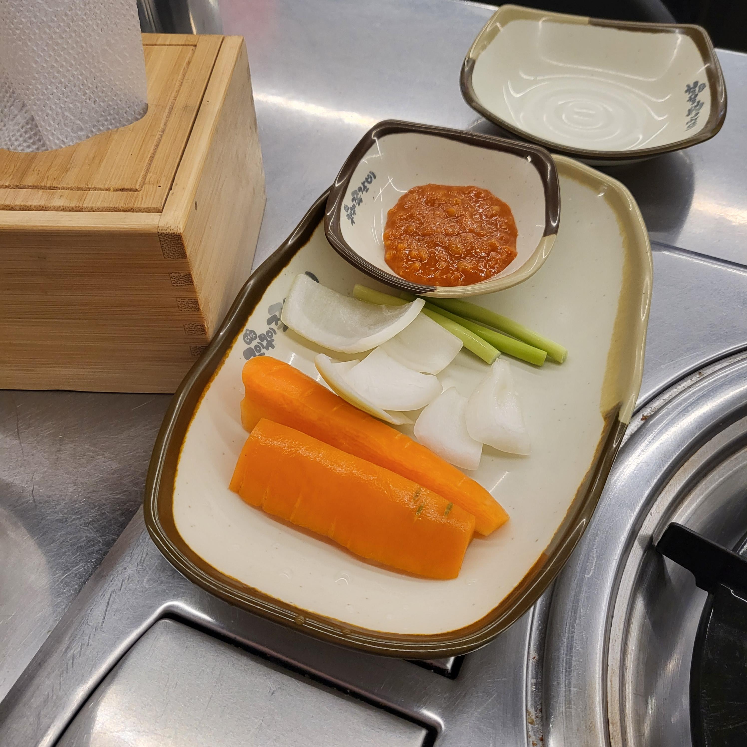 구이구이 쪽갈비 500g 16,000원, 매운쪽갈비 500g 17,000원 1인분씩 주문했어요 주문후 기본반찬이 차려지는데 김치, 양파장아찌, 콩나물무침, 당근 마늘쫑, 미역국이 나와요