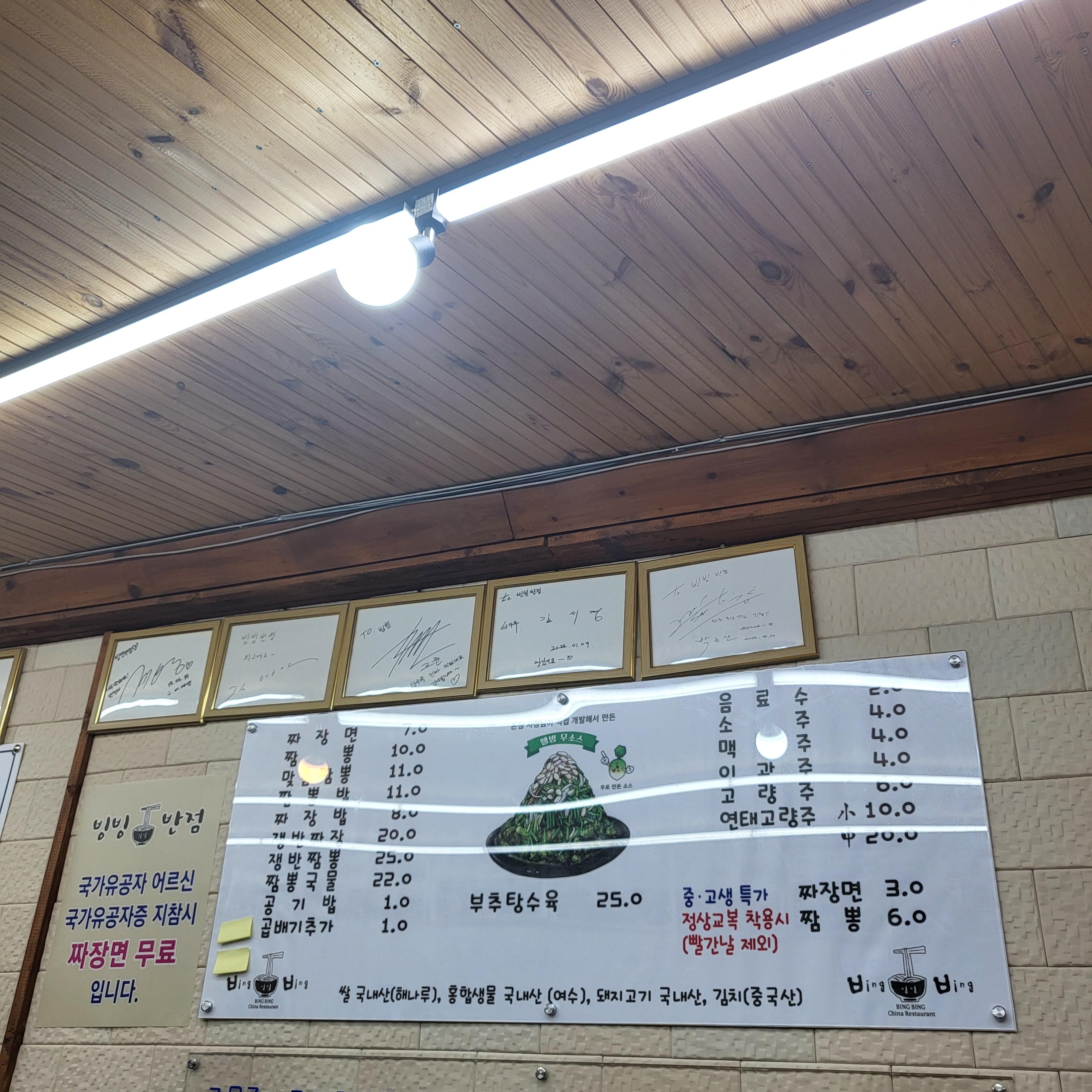 당진에 가끔 갈일이 있는데 갈때마다 맛집을 검색해서 다녀와요 이번엔 부추탕수육으로 유명한 빙빙반점에 다녀왔어요 빙빙반점에 도착해서 입구만 봤을때는 작은 식당처럼 보였는데 안으로 들어가니 안쪽으로 홀이 넓은 식당이더라구요 유명한 맛집이라 입구쪾에 번호표 기계도 있고 대기의자도 있어요 당진맛집 빙빙반점은 중국집으로 메뉴는 짜장면, 짬뽕, 짜장밥, 짬뽕밥, 쟁반짜장, 쟁반짬뽕, 부추탕수육을 판매해요