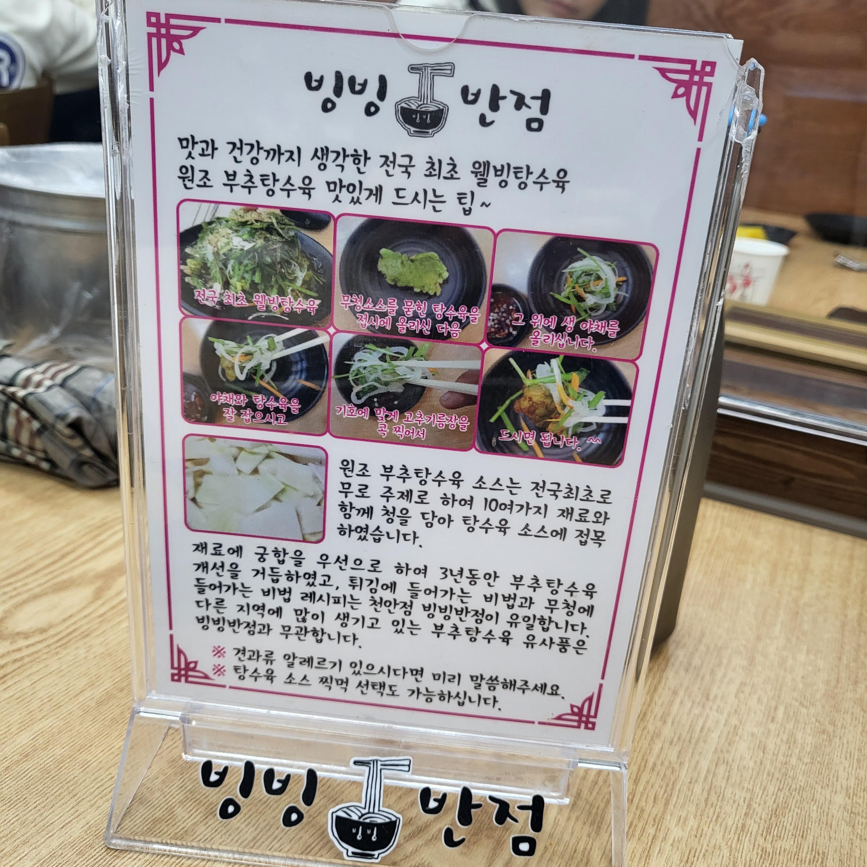자리에 앉기전 주문부터 받아요 부추탕수육(가격 25,000원)과 짬뽕밥(가격 11,000원)을 주문했어요 자리에 앉아 웰빙탕수육 맛있게 먹는 팁을 읽어봤어요 부추탕수육 맛있게 먹는 법은 무청소스를 묻힌 탕수육을 접시에 올리고 생야채를 올려 고추기름장에 콕 찍어 먹는 거라고 해요