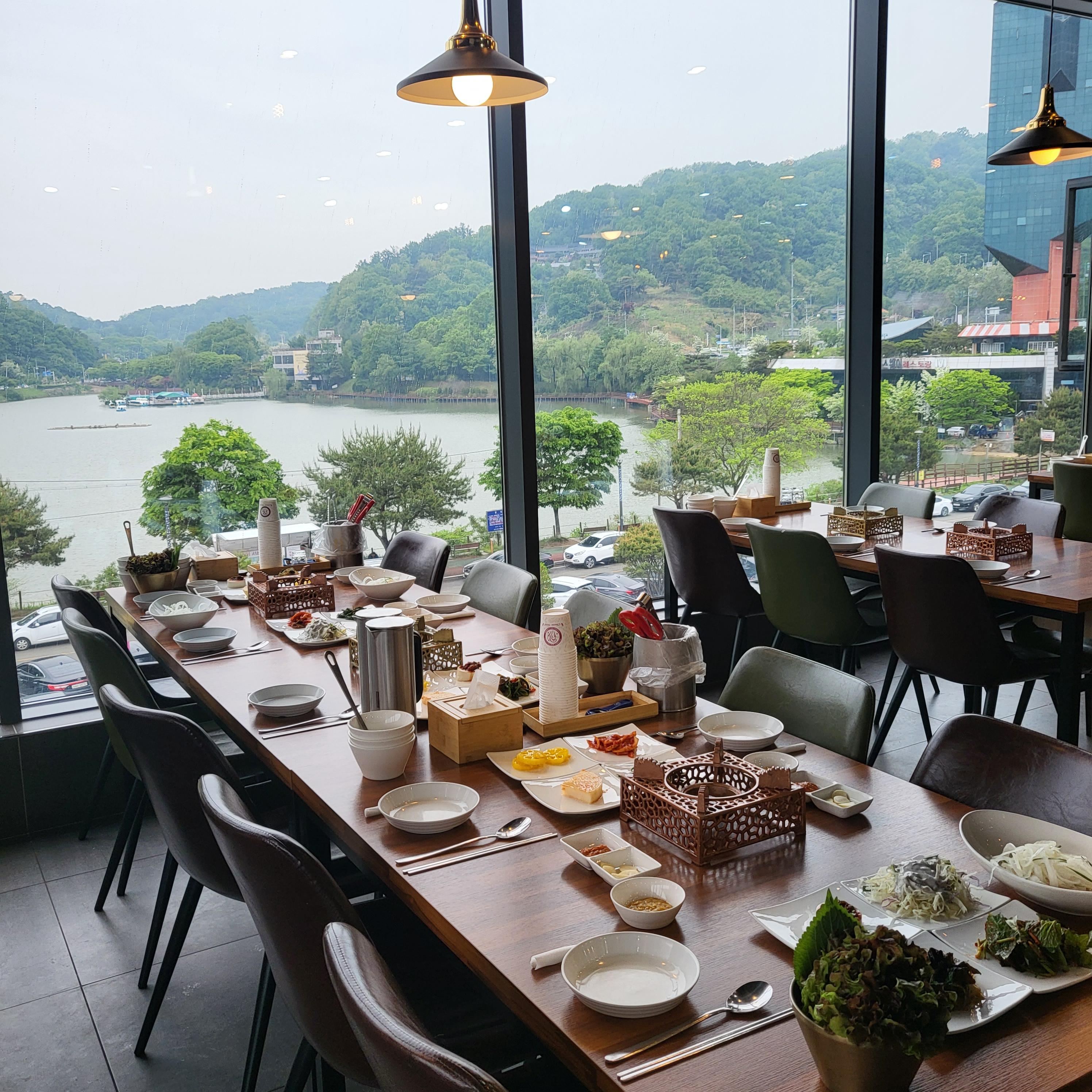 도착해서보니 실내는 넓고 굉장히 깔끔해요 저수지 뷰, 예약된 자리에 테이블 세팅도 잘 되어있어서 좋았어요