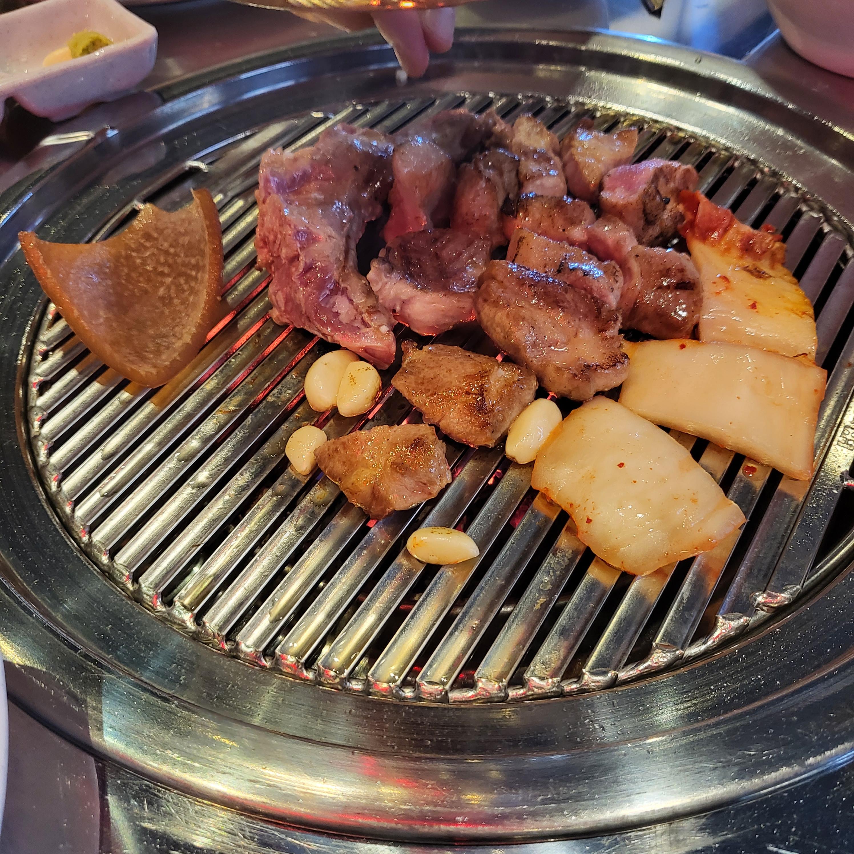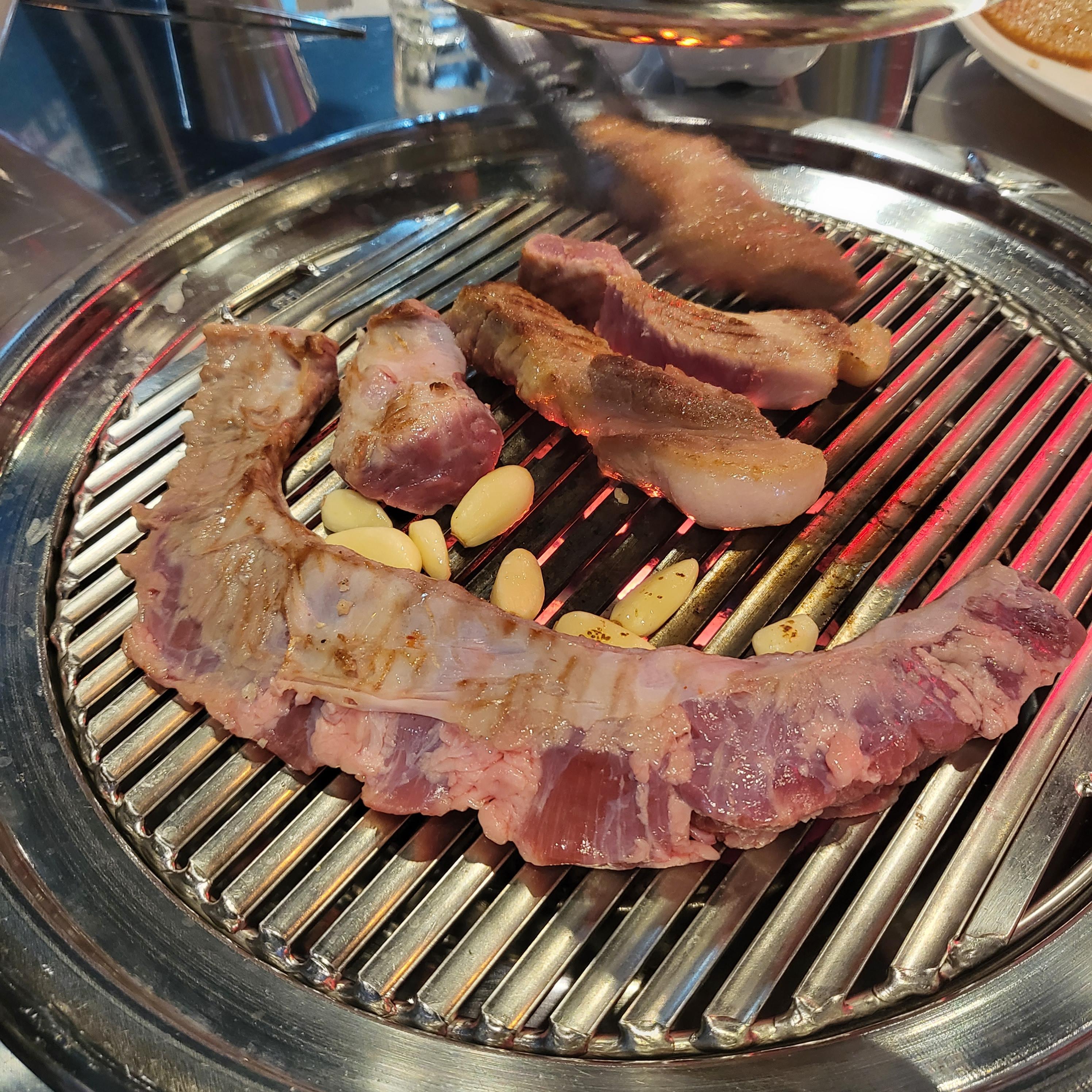 통갈매기살도 쫀득하고 넘 맛있어요 김치와 마늘도 함께 구워 야무지게 먹어요