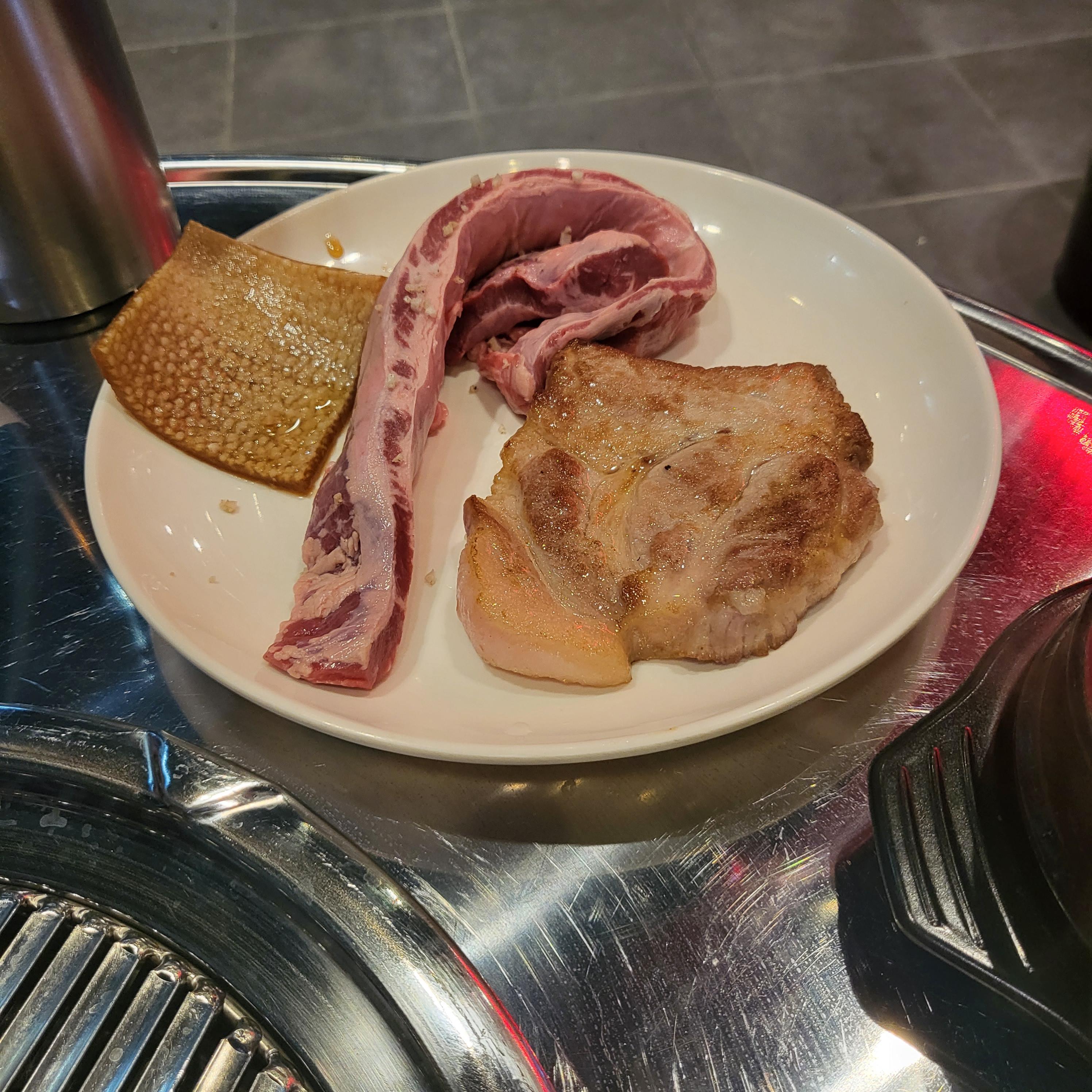 처음 주문한 메뉴는 목살과 통갈매기살이에요 돼지껍데기도 서비스로 주시네요 두툼한 목살은 초벌이 되어 나와요 고기가 신선하고 맛있어 보여요