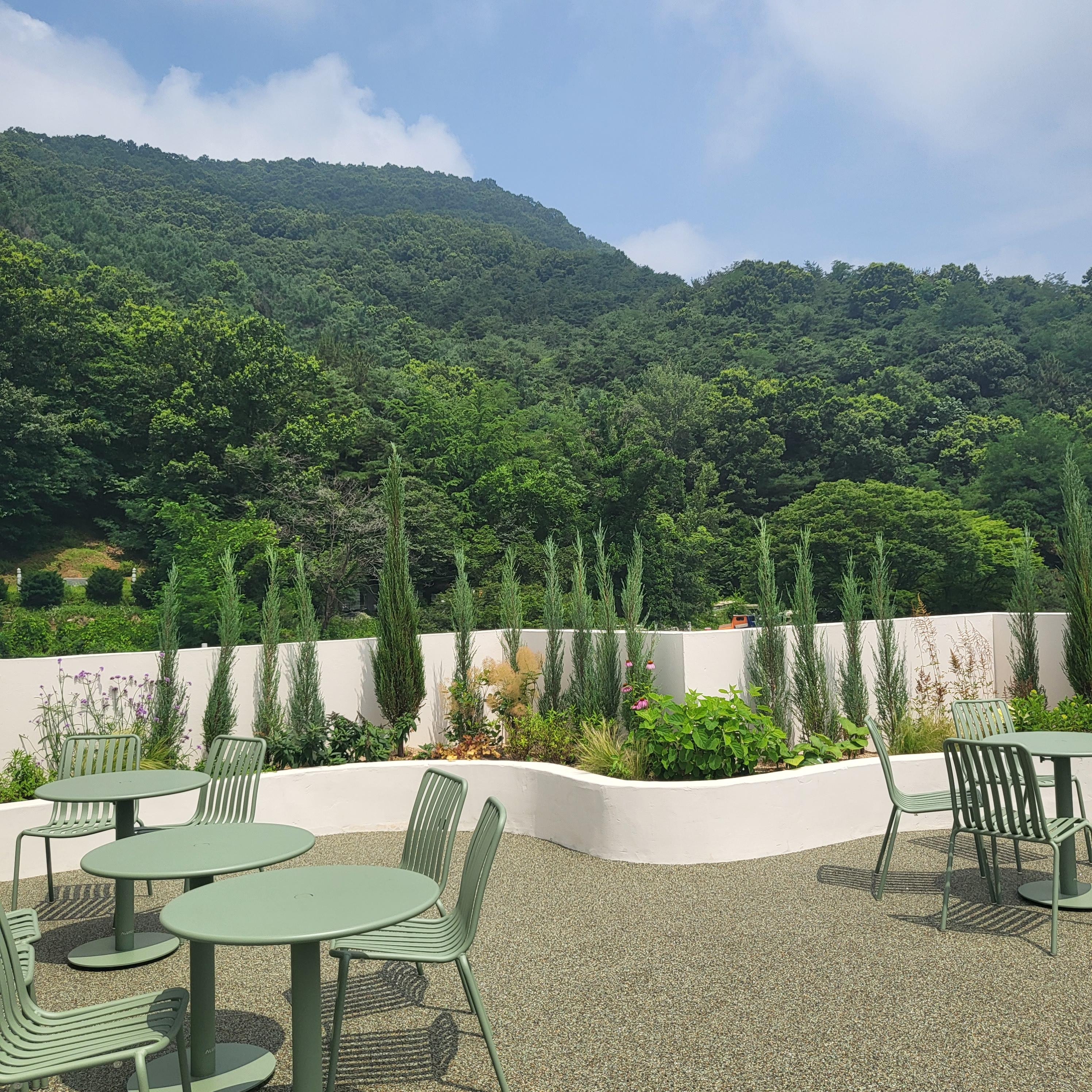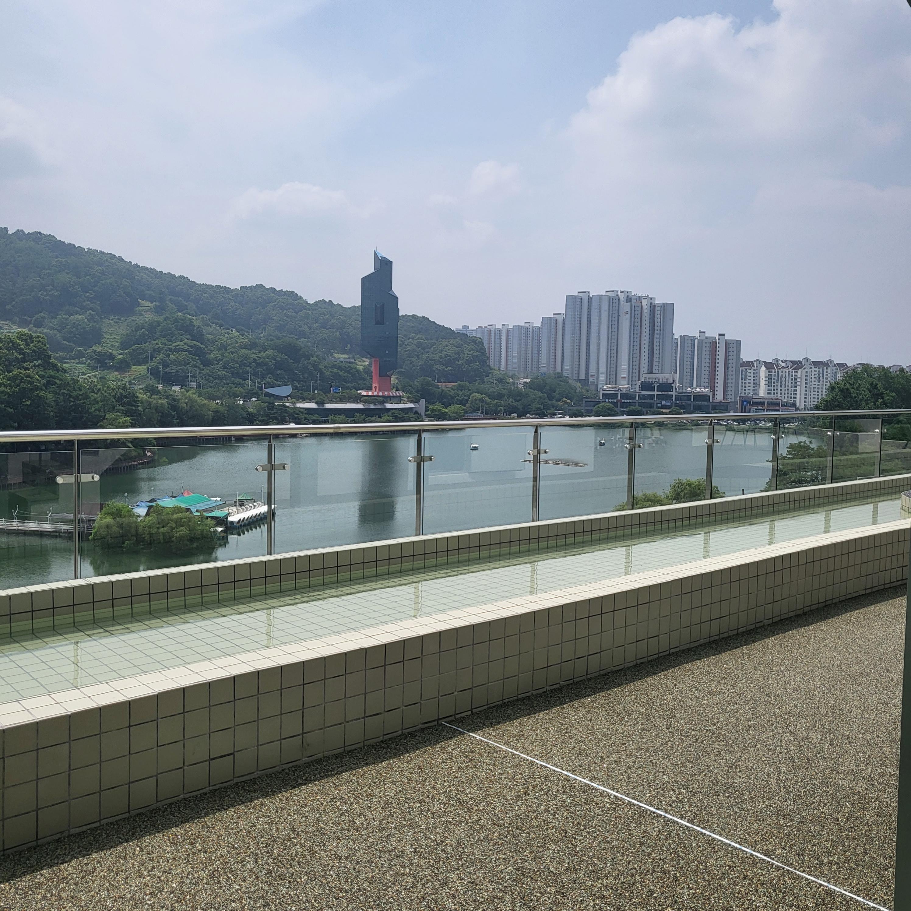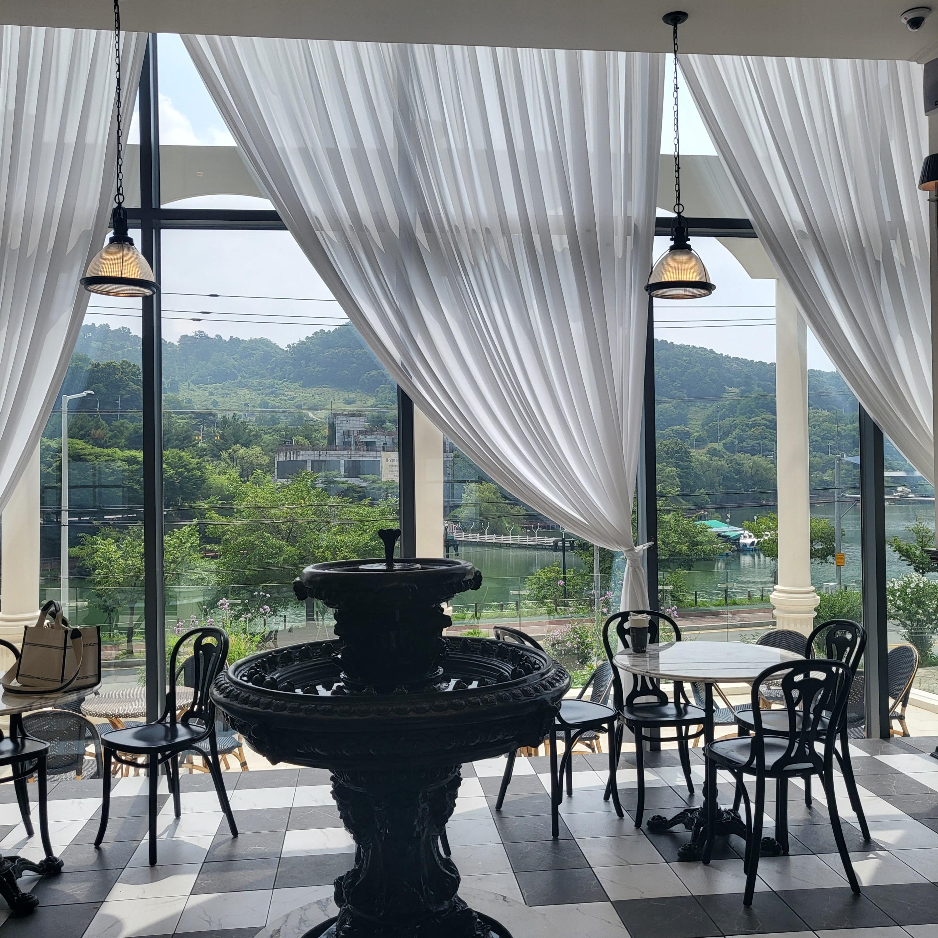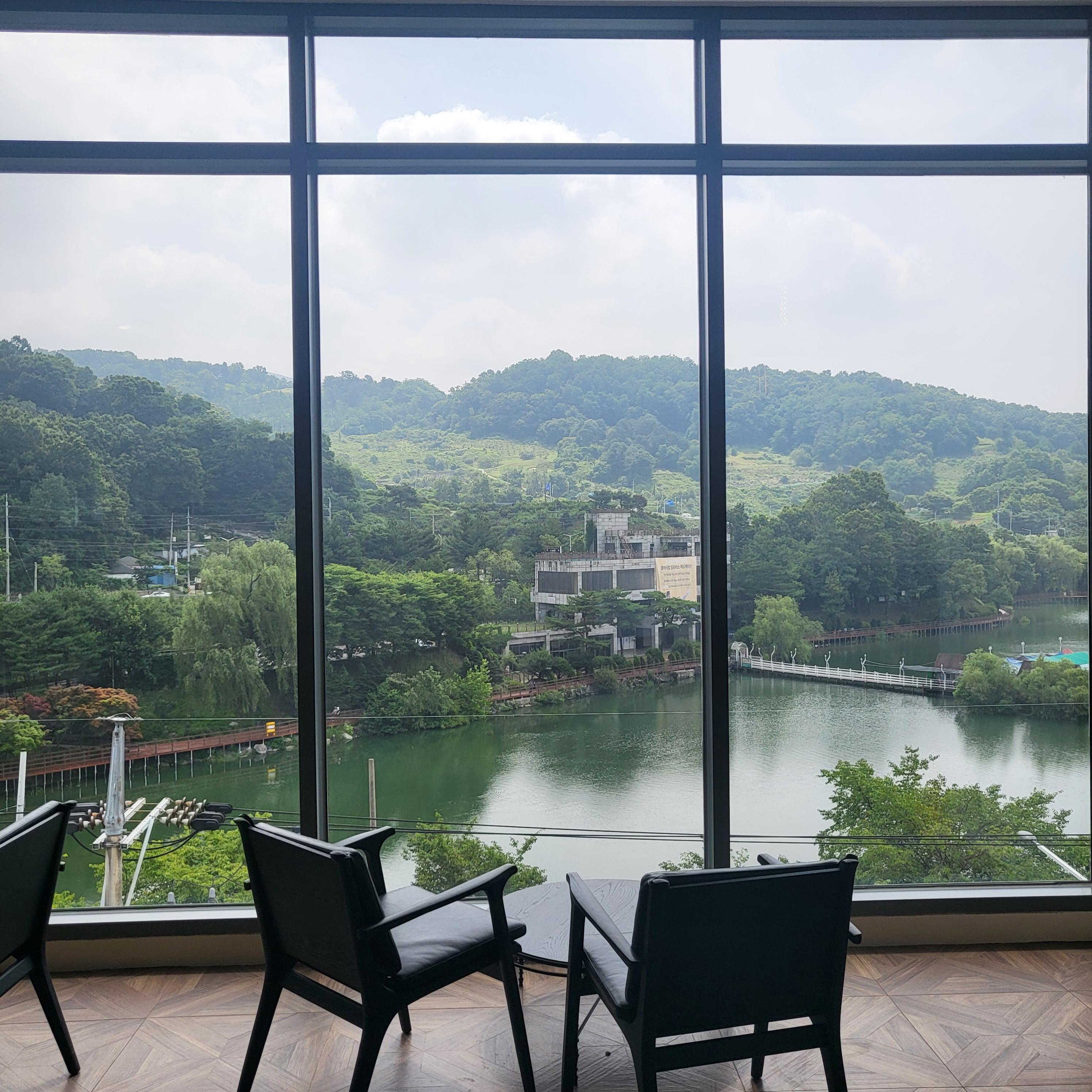 청주 명암저수지 뷰가 한눈에 들어오는 뷰맛집 카페라 가만히 앉아서 물멍하기 좋아요 지금은 여름이지만 곧 가을이 되면 낙엽이 진 산과 나무들을 봐도 참 좋을것 같아요