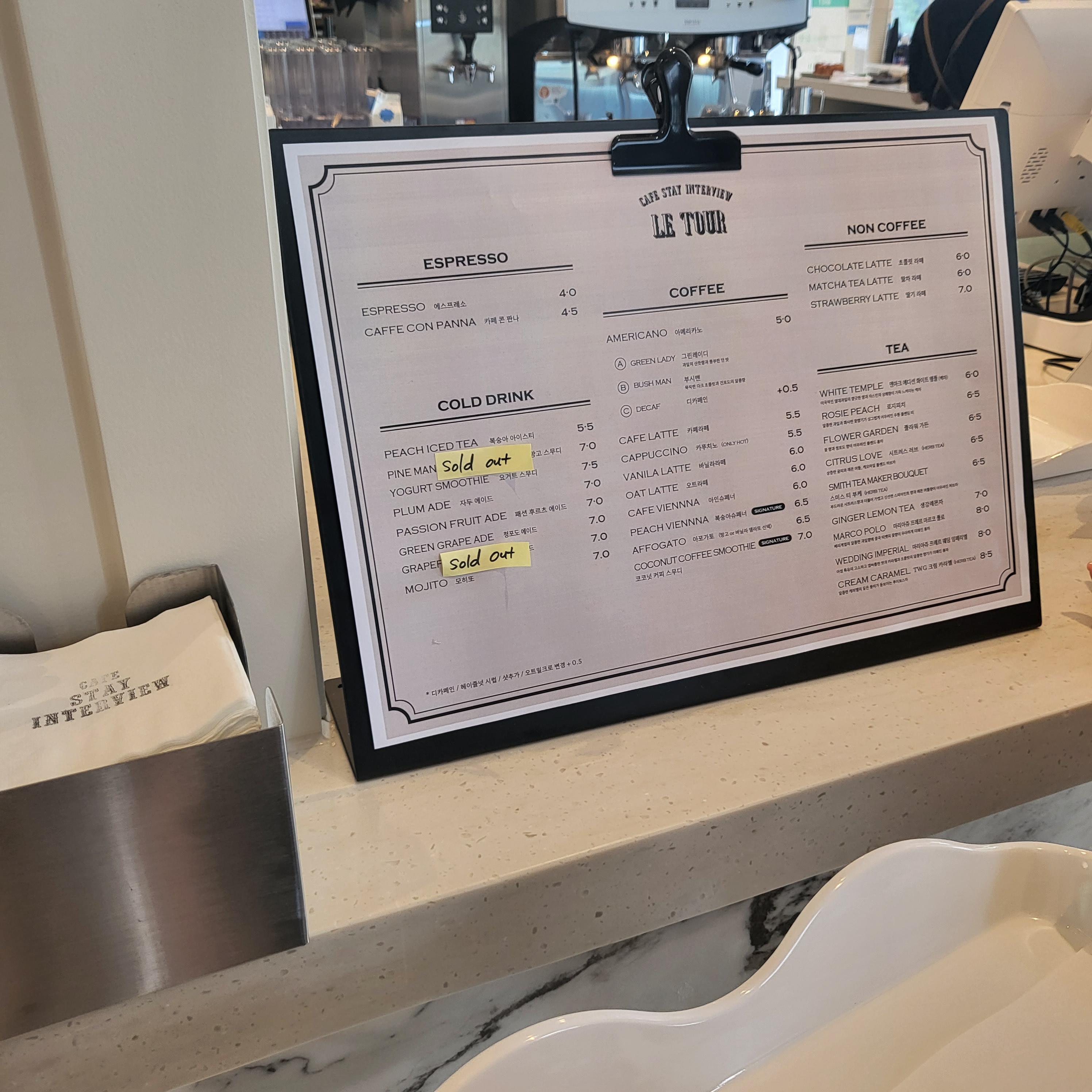 스테이인터뷰 르투어의 메뉴에요 음료 메뉴가 다양하고 젤라또 아이스크림 코너도 따로 있어서 메뉴를 다양하게 선택할수 있어요
