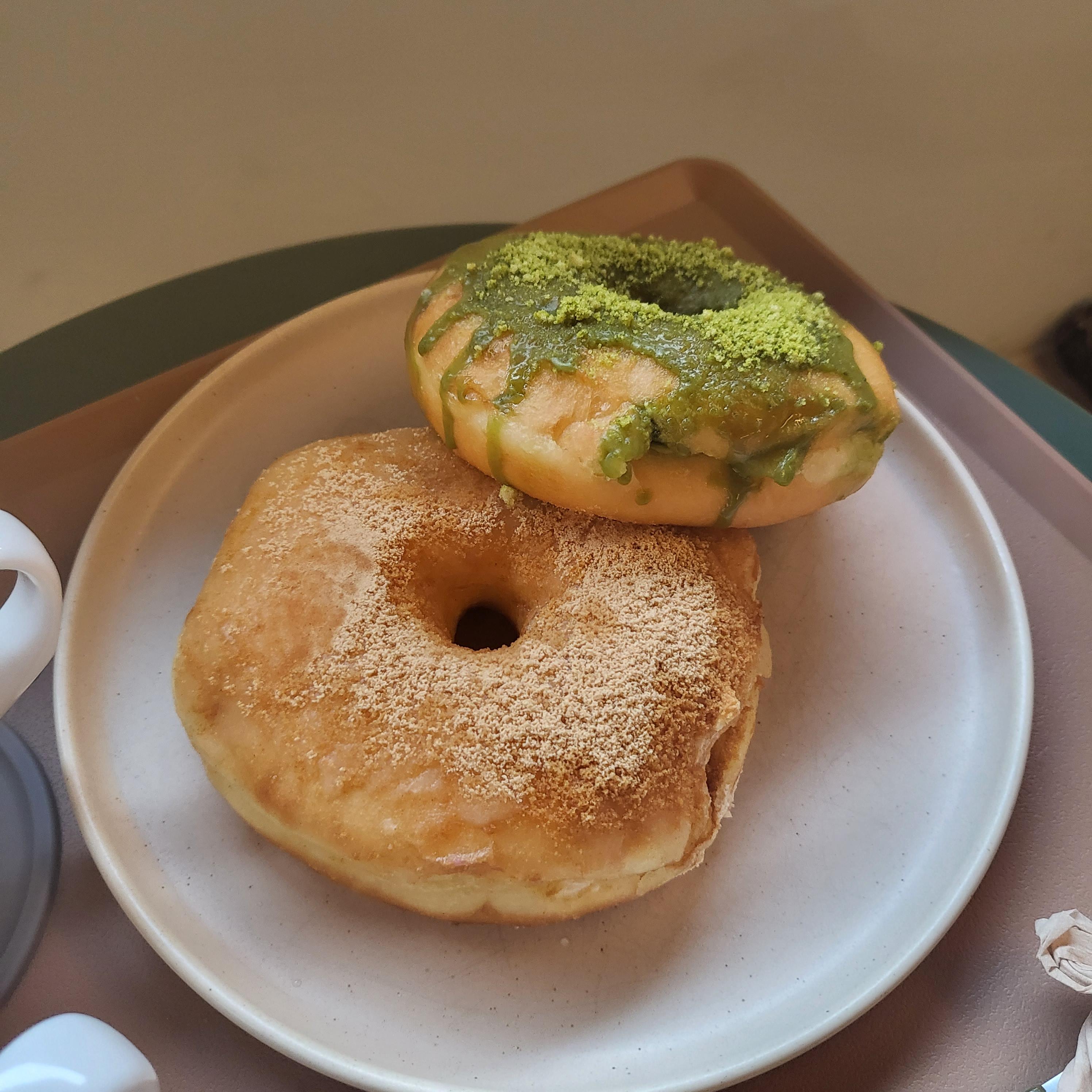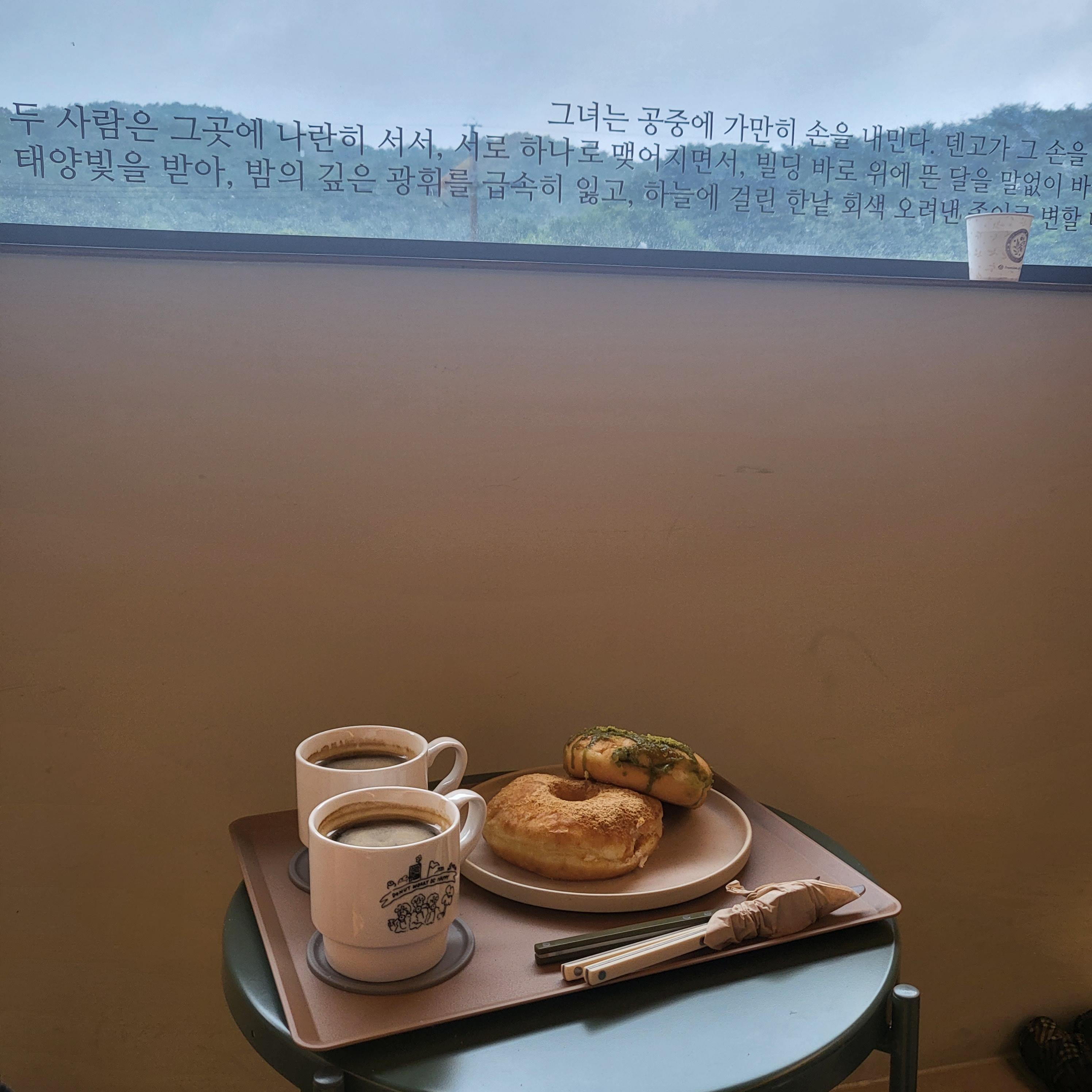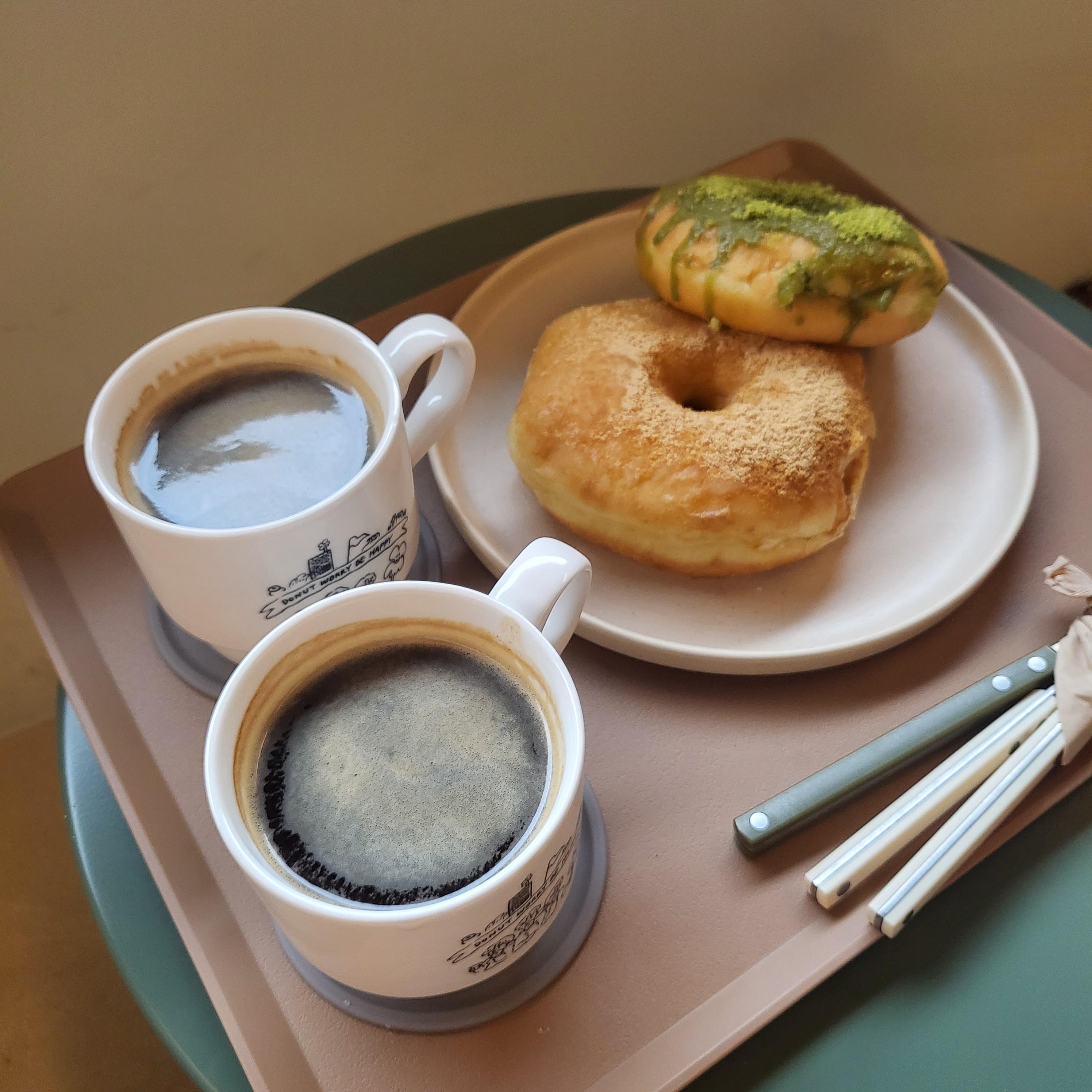우리가 주문한 커피와 도넛이에요 진하고 구수한 커피와 달콤한 도넛의 조합은 말이 필요없죠 아메리카노 4천원 인절미도넛, 말차도넛 각3,900원 커피와 도넛 가격도 착해요
