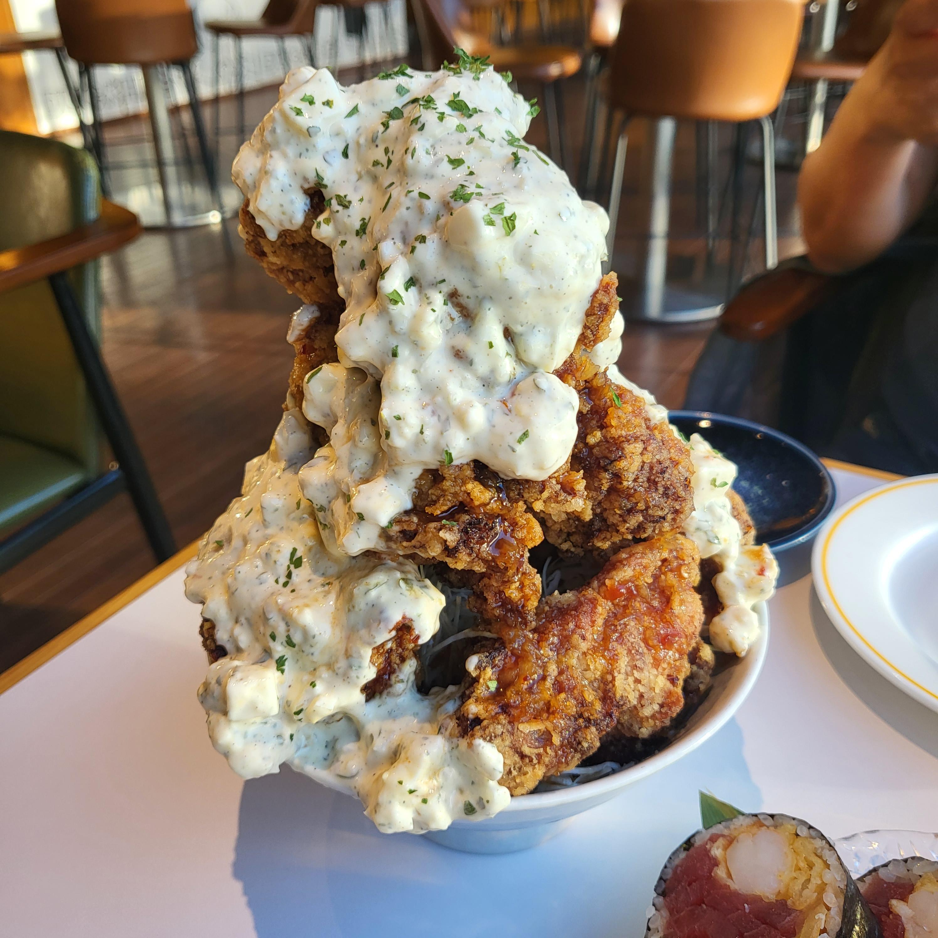 치킨난반은 처음 시켜보는 메뉴인데 비주얼이 엄청나요 치킨난반은 닭다리살을 튀겨 타르타르 소스를 부운 메뉴인데 굉장히 푸짐해요 닭다리살 튀김이 바삭하고 소스랑 잘 어울려요 접시안에 양배추가 들어 있어 함께 먹으면 덜 느끼해요