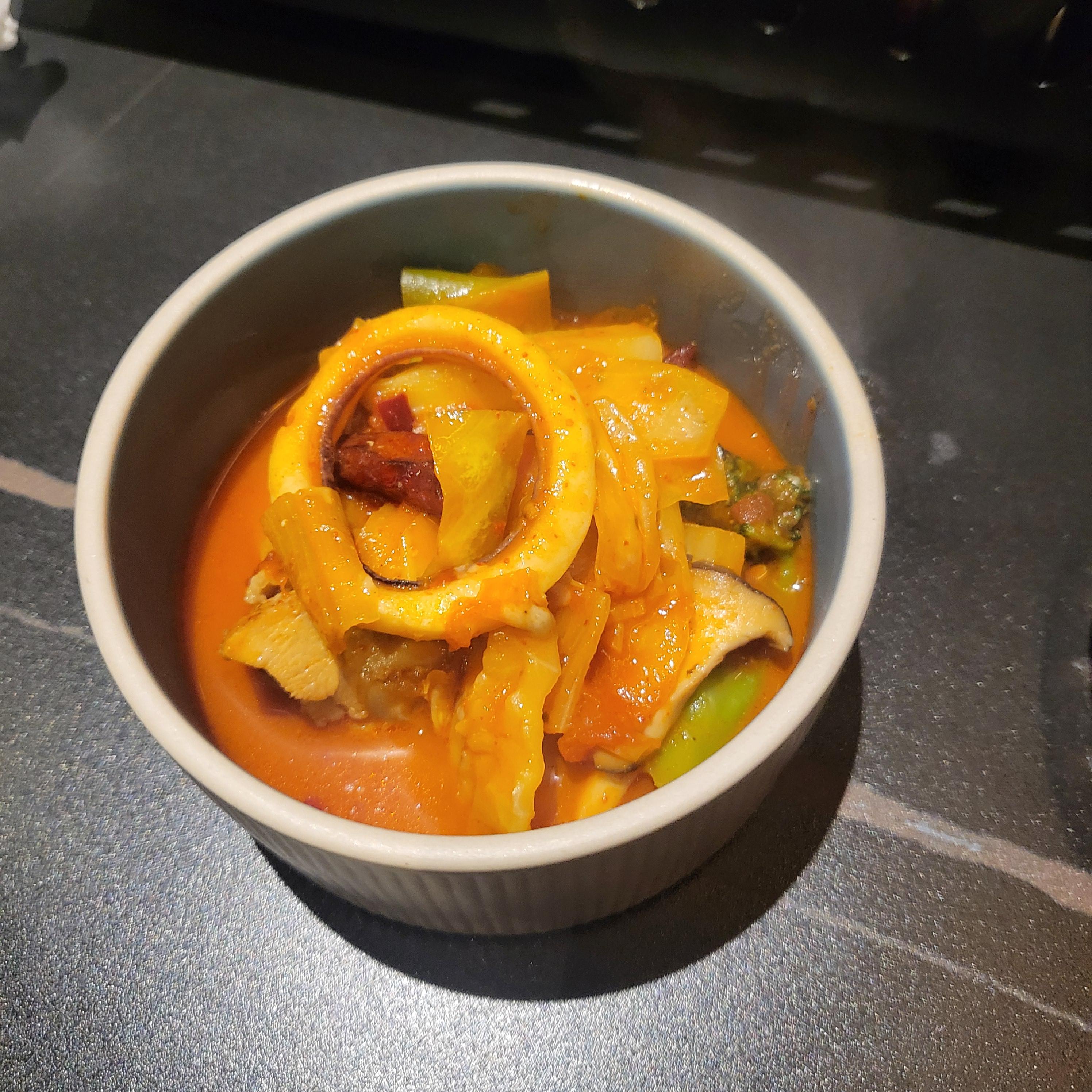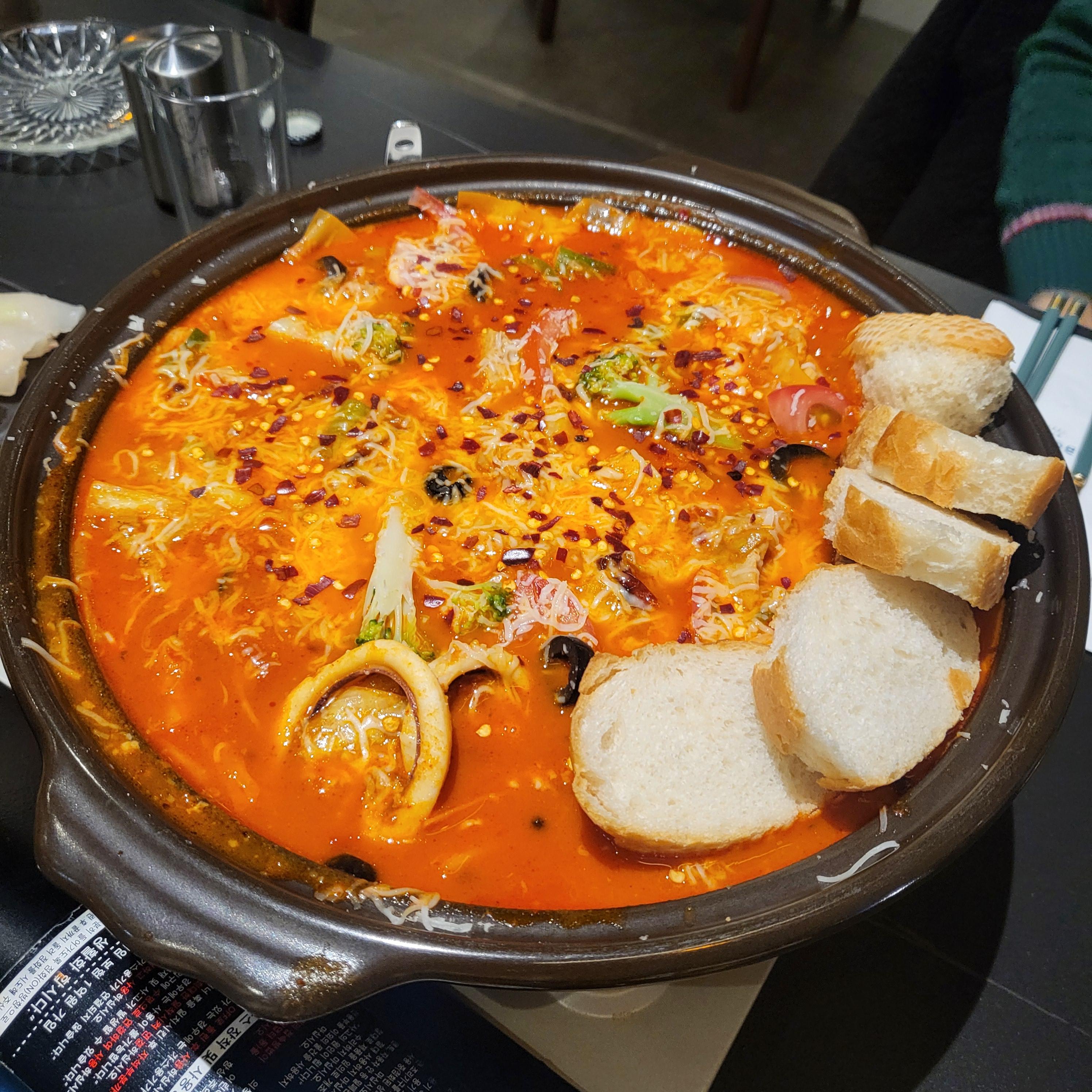 토마토 스튜는 해산물, 고기, 야채가 가득 들어있어요 매콤해서 술안주 국물요리로 아주 좋더라구요