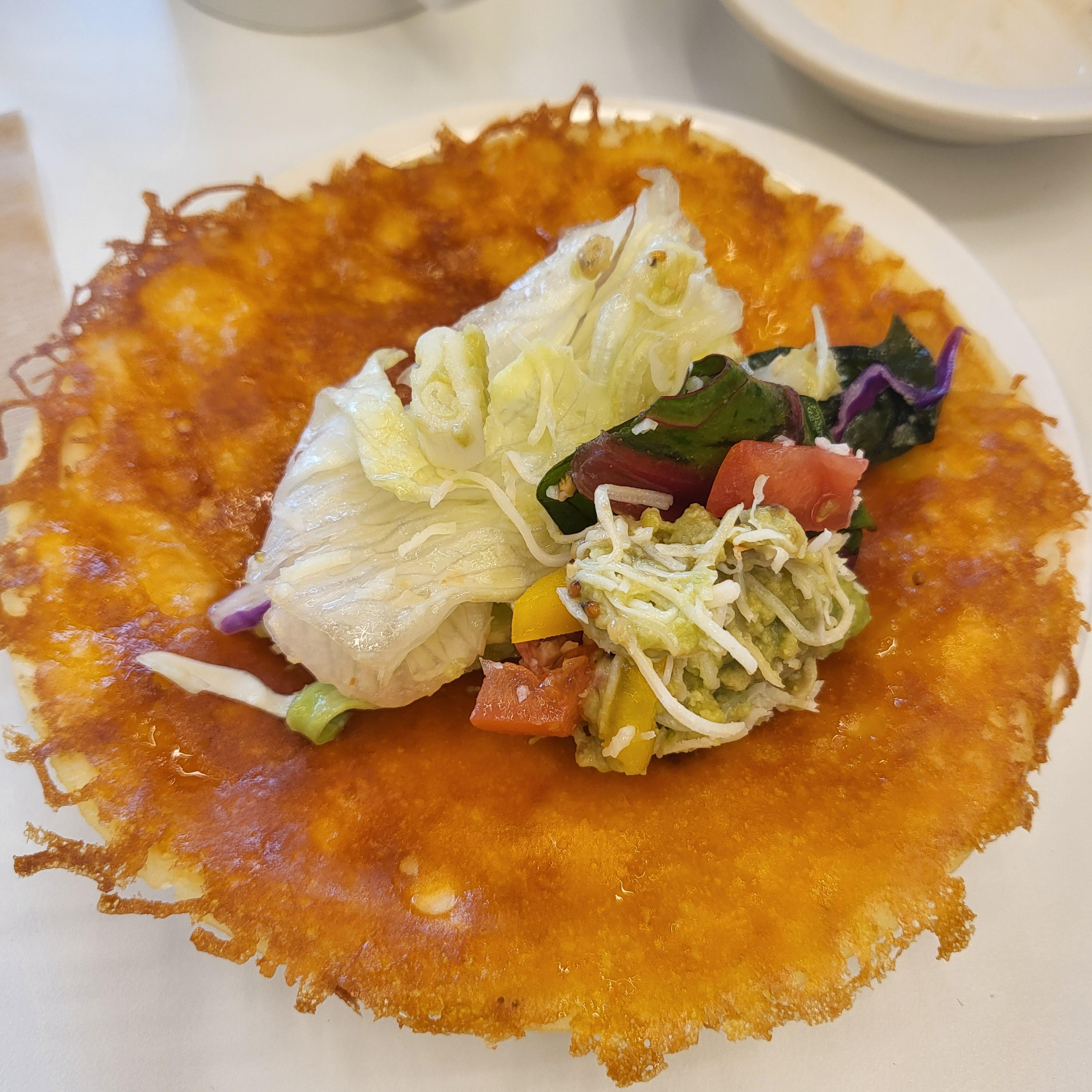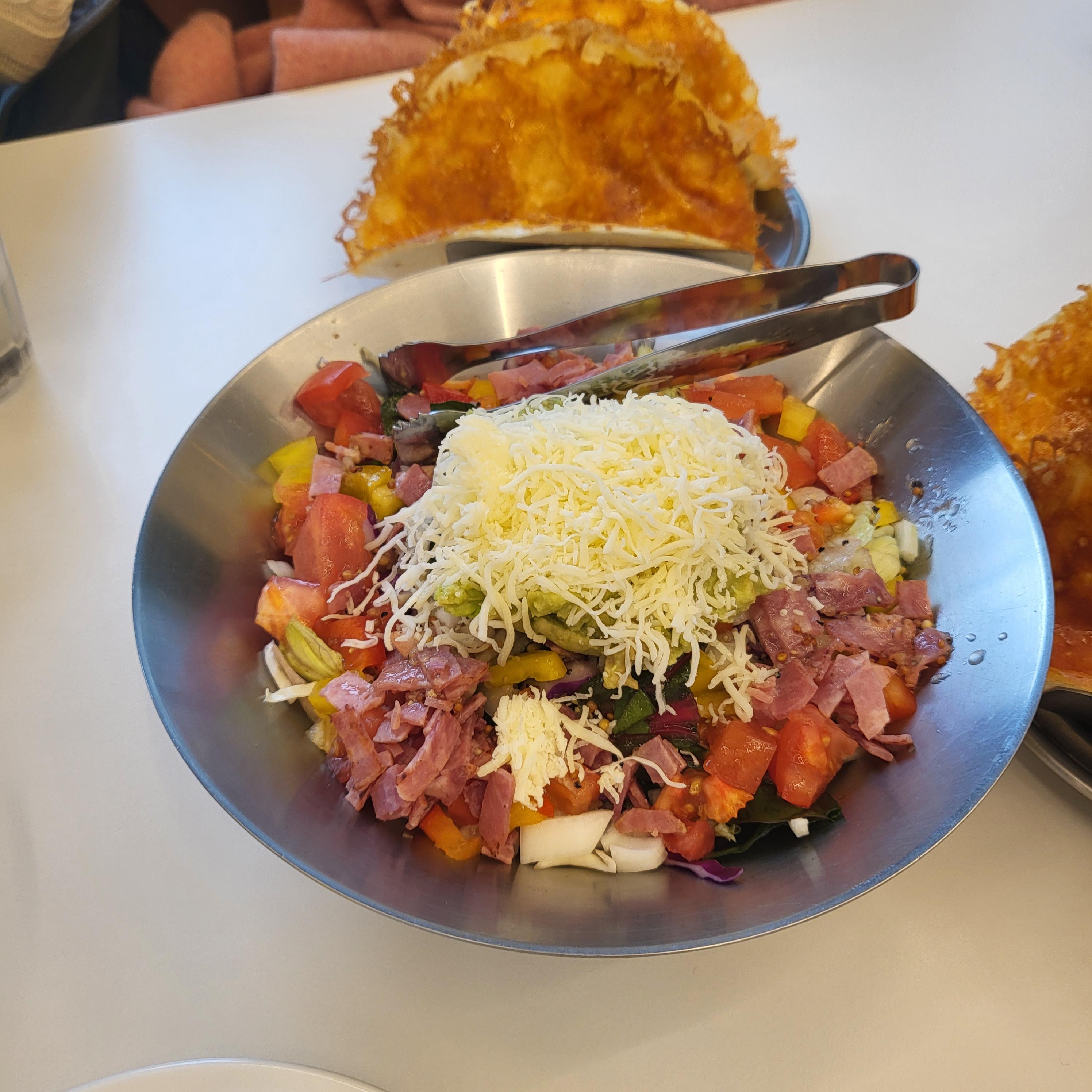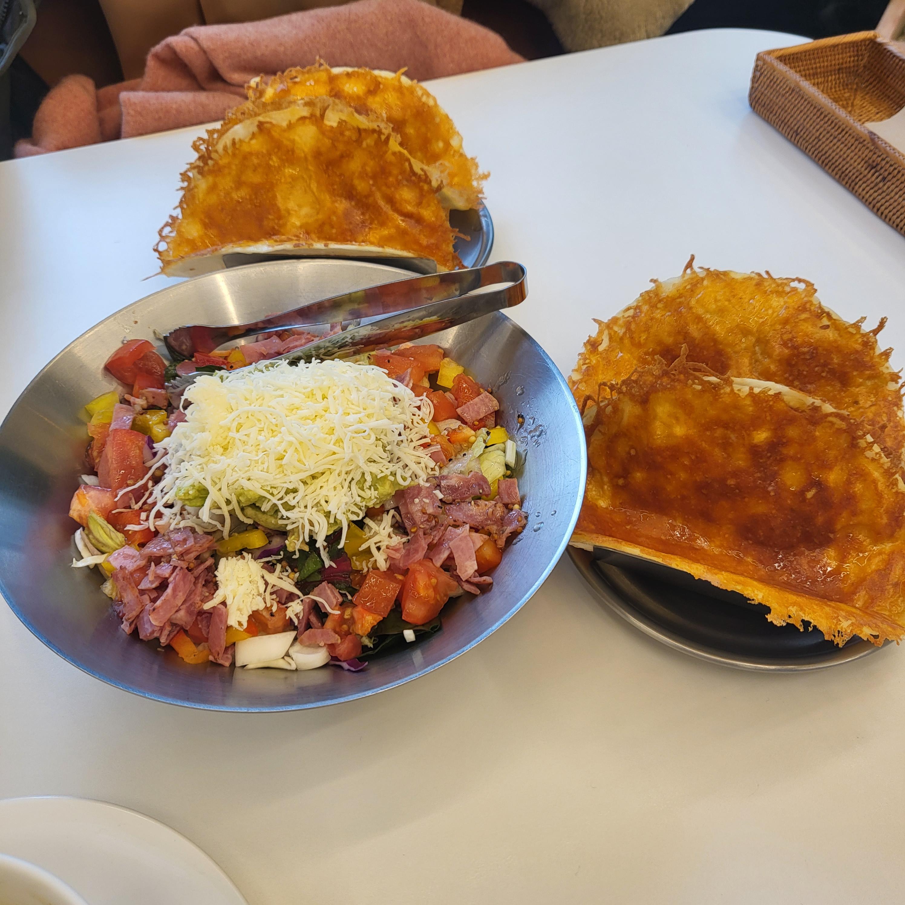 다음으로 나온 메뉴는 치즈타코 샐러드에요 또띠아에 치즈를 입혀 구워서 비주얼도 좋고 맛도 좋더라구요