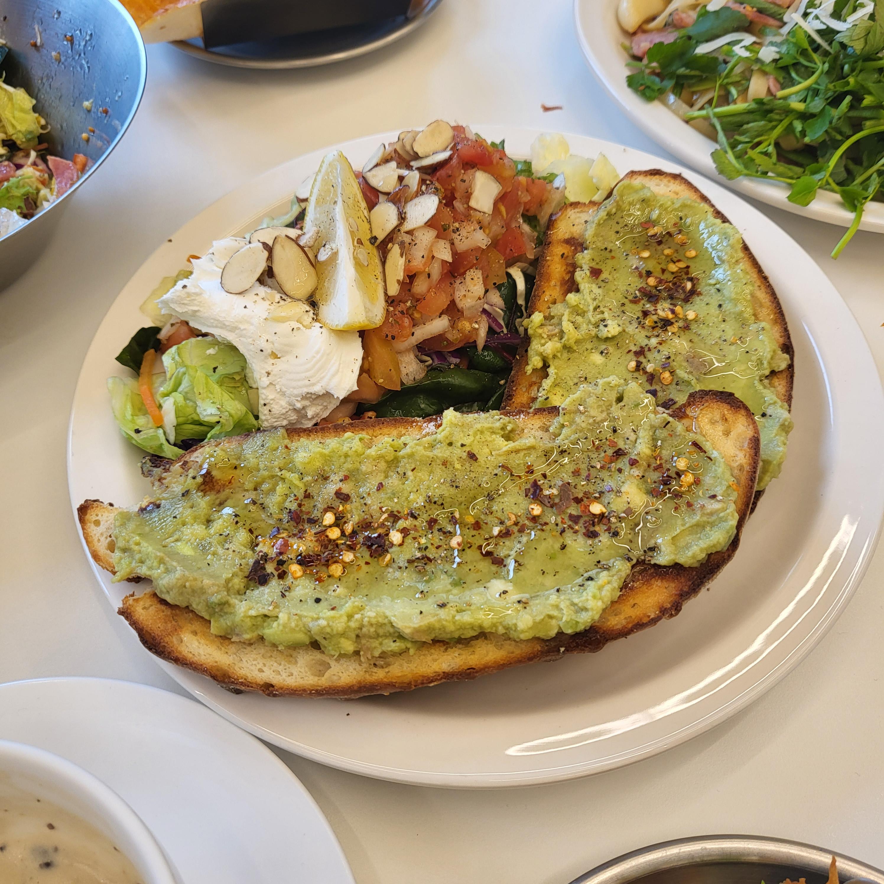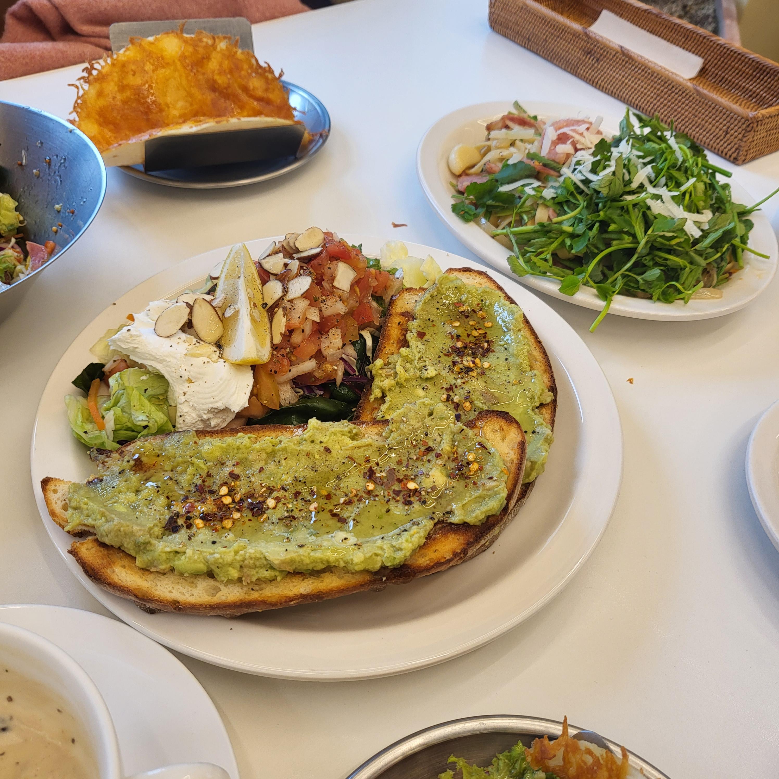 다음으로 나온 메뉴는 아보카도 토스트에요 샐러드와 함께 나오고 구운 통밀빵에 아보카도가 듬뿍 올려져 있어요