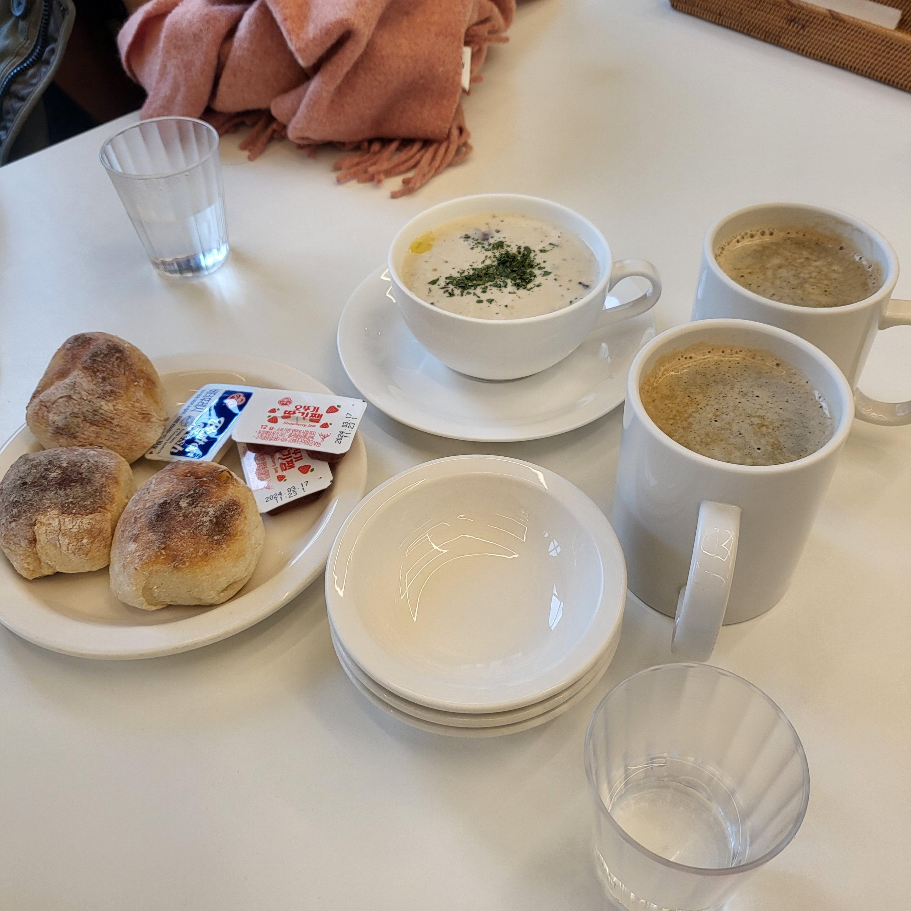 메뉴를 한참 고르고 주문했는데 먼저 부드러운 양송이 스프와 치아바타 빵 그리고 커피가 나왔어요 치아바타는 매장에서 직접 구워서 부드럽고 쫀득해서 스프에 찍어 먹어도 맛있고 커피랑 먹기에도 좋더라구요